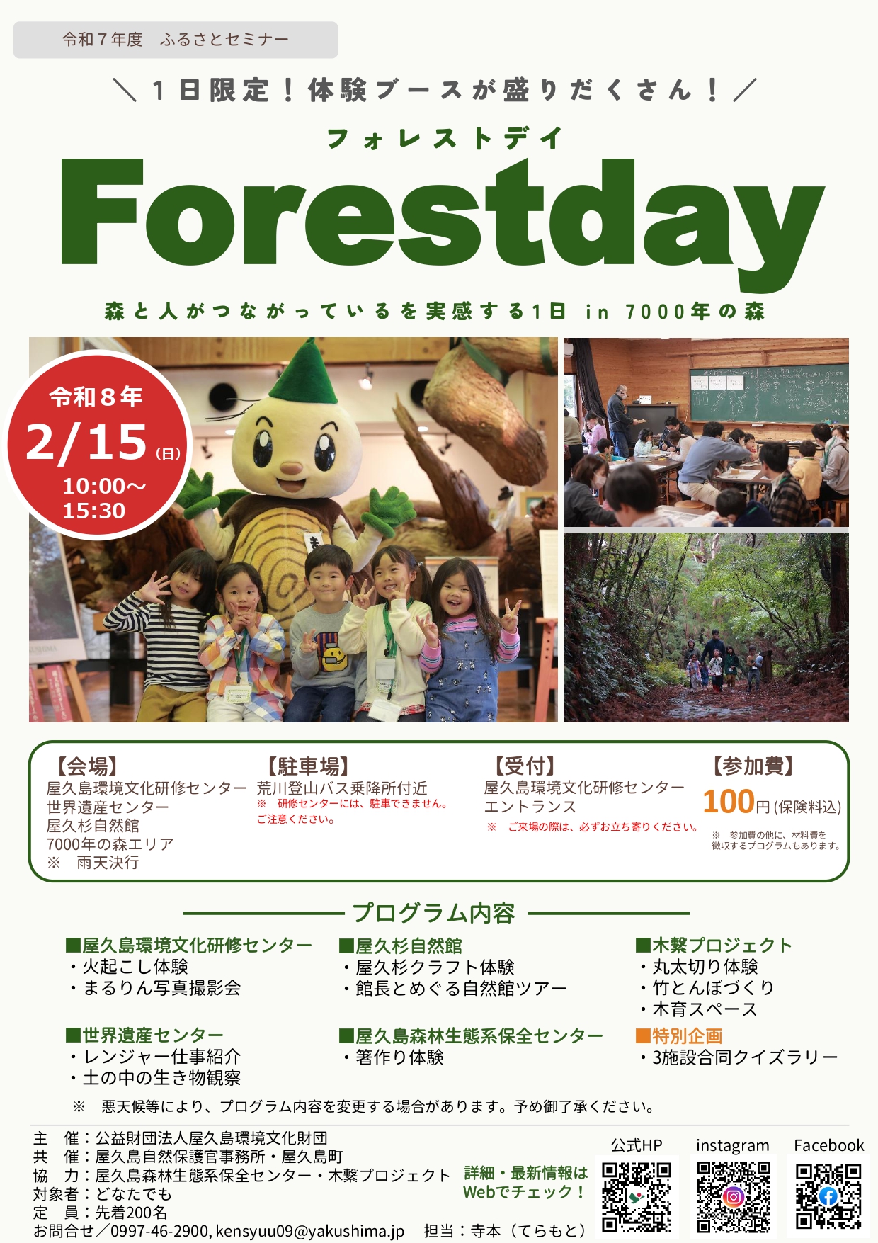 屋久島環境文化研修センターでは,令和8年2月16日(日)に,「Forestday『森と人がつながっている』を実感する1日 in 7000年の森」を開催します。木を使ったクラフト体験など,多様なプログラムを通じて「森と人とのつながり」を感じてみませんか。事前予約は不要です。どうぞお気軽にお越しください。