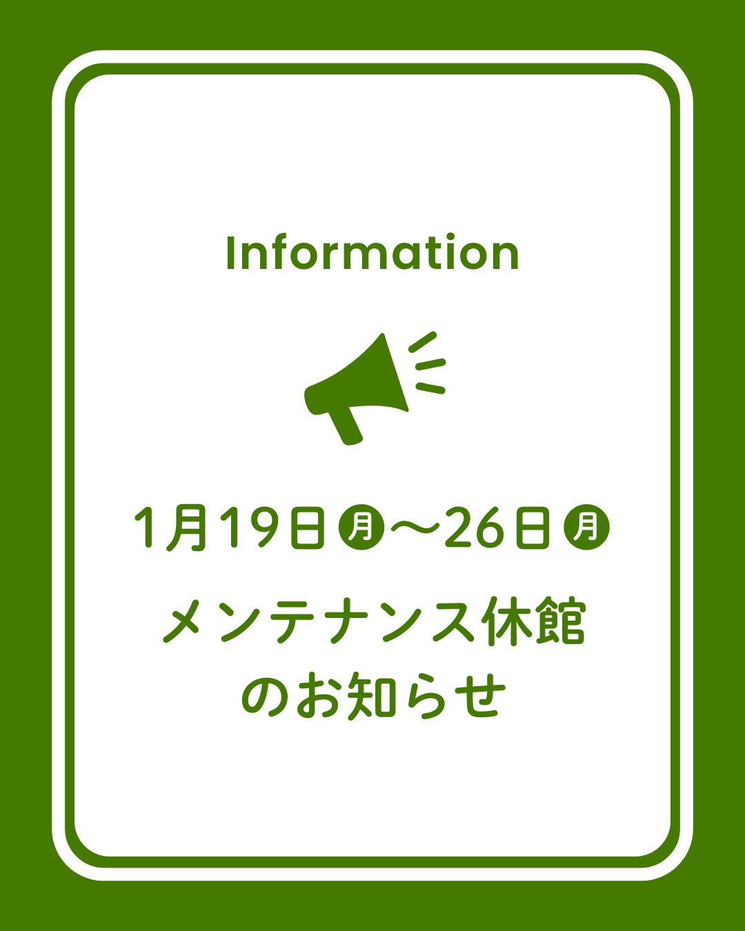 屋久島環境文化村センターでは、令和8年1月19日(月)から1月26日(月)までの間、当館の施設メンテナンスを行うため、休館いたします。