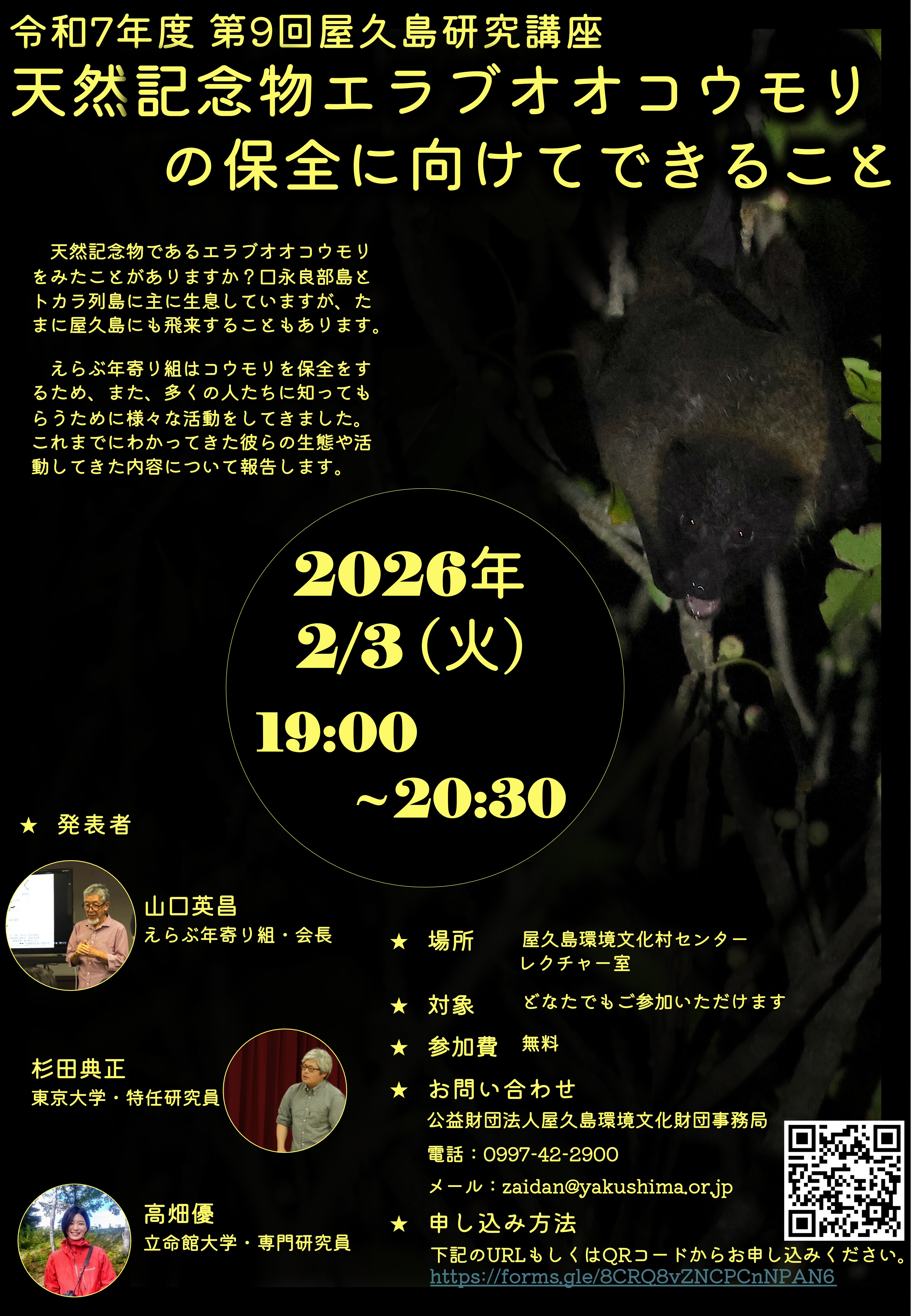 屋久島環境文化財団では、令和7年度第9回屋久島研究講座を以下のとおり開催します。多くの方のご参加をお待ちしています。